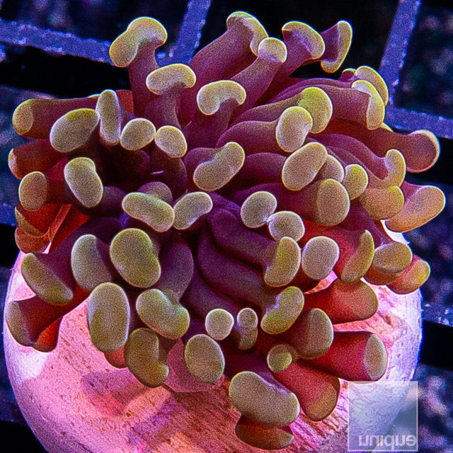 These are grafted purple, green and splattered.  They open up to be 2-3" each when happy.  Super neon and bright especially when viewed under actinic blue lighting.  These are very hardy and grow fast when established.  New babies will pop out from the base and look like little anemones at first but after a few months they will be clearly defined and quick growing new stalks.  Once the tissue is clear of the stalk base they are able to be fragged if desired.