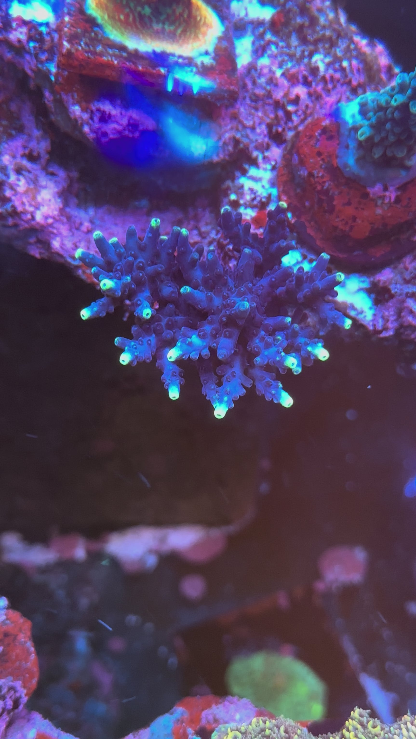 Very similar to the Jason Fox Flame, this coral features intense blue/purple coloration throughout the coral with bright neon yellowish green tips.