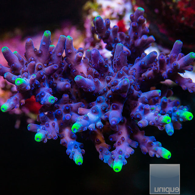 Very similar to the Jason Fox Flame, this coral features intense blue/purple coloration throughout the coral with bright neon yellowish green tips.