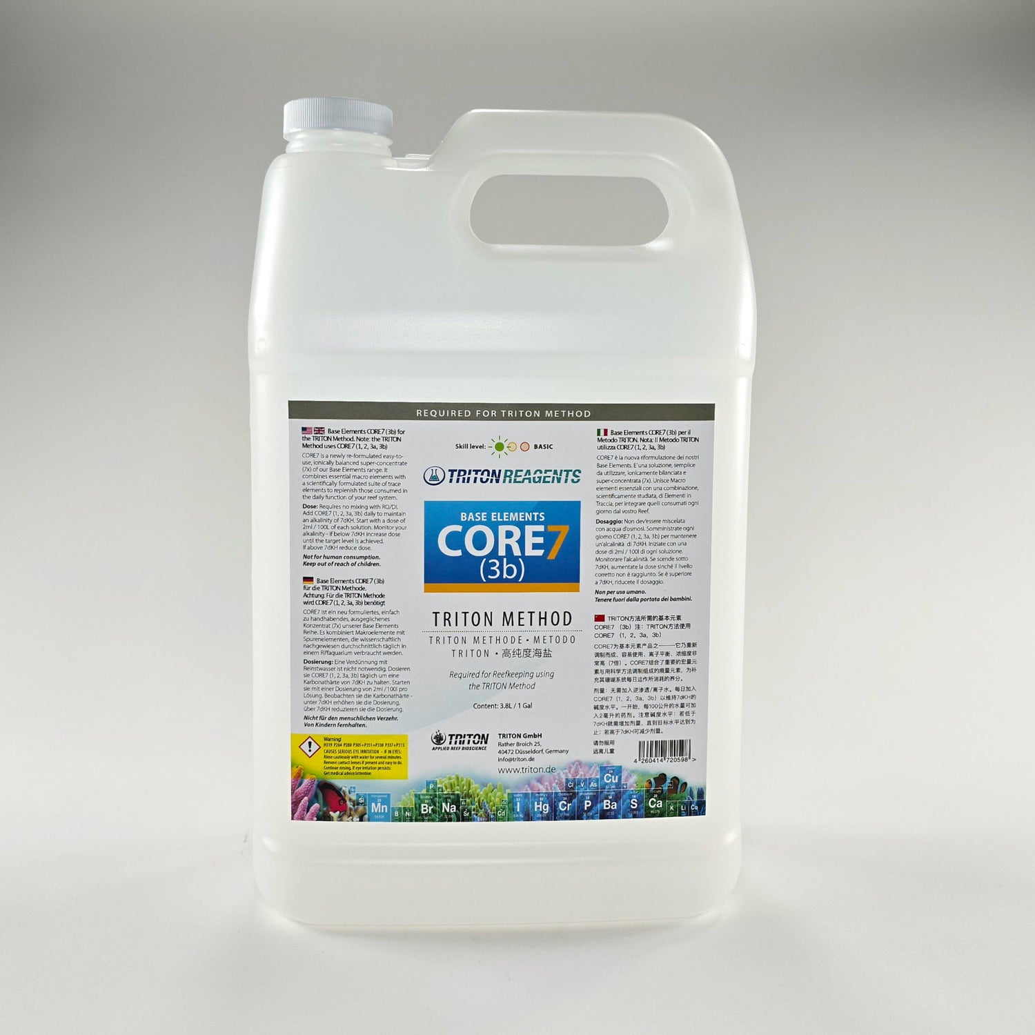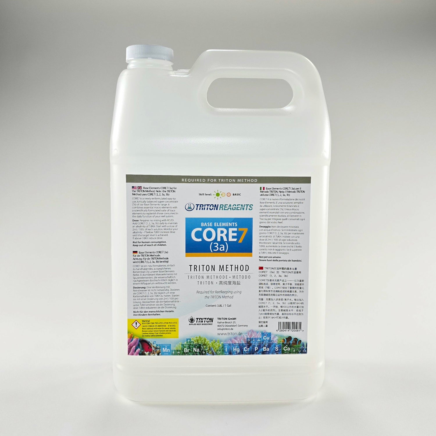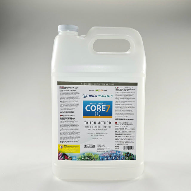 For Triton Method: CORE7 is a next generation of dosing solutions designed to supplement and maintain near natural sea water parameters for reef aquaria using the TRITON Method of reefkeeping. CORE7 improves on the original Base Elements range of supplements in several key ways. CORE7 is revolutionary because they are the most concentrated solutions ever developed, no other supplementation method in the world comes close in terms of value and stability. They do not need to be diluted, they can be used direct from the bottle saving space and eliminating the hassle / mess of preparation. CORE7 solutions have been re-formulated to be even more stable and include a raised pH to promote coral growth.
