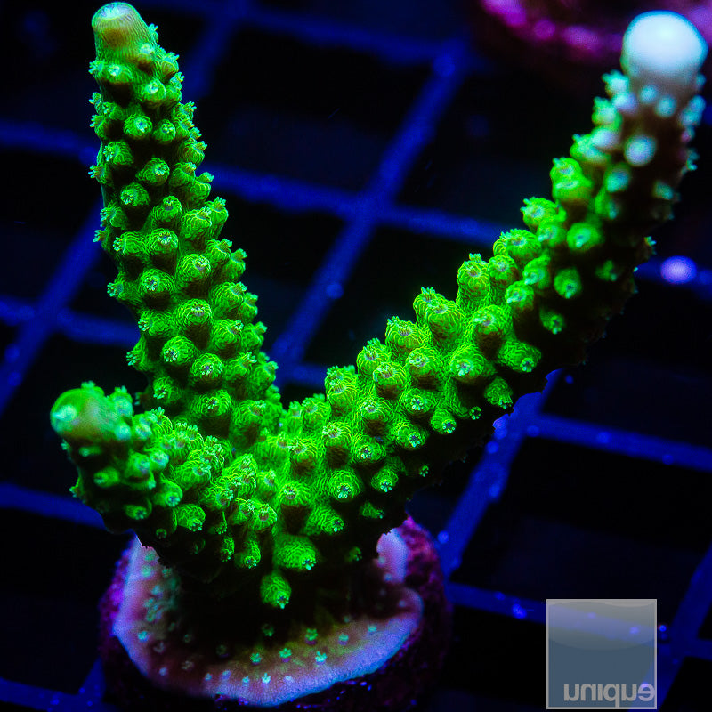 HUSBANDRY NOTES: SPS- We keep our corals under Dalua/Illumagic X4 LED lights with an intensity of approximately 200-250 PAR and feed regularly with Polyp Lab Reef Roids and BenePets.This is a WYSIWYG item. You will be purchasing the actual coral shown in the photo.